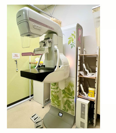 マンモグラフィとは、乳房を板で挟み薄く伸ばした状態でX線撮影を行う検査です。マンモグラフィは乳がんや乳腺症など、乳腺(乳汁を分泌する器官)におこるさまざまな病変の発見や診断に役立つ検査です。