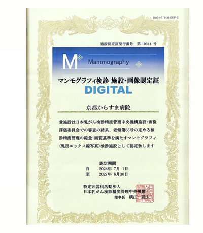 当院は日本乳がん検診精度管理中央機構が行っている施設画像認定を取得しており、適切な画像提供および線量評価が行えていることが認められています。
